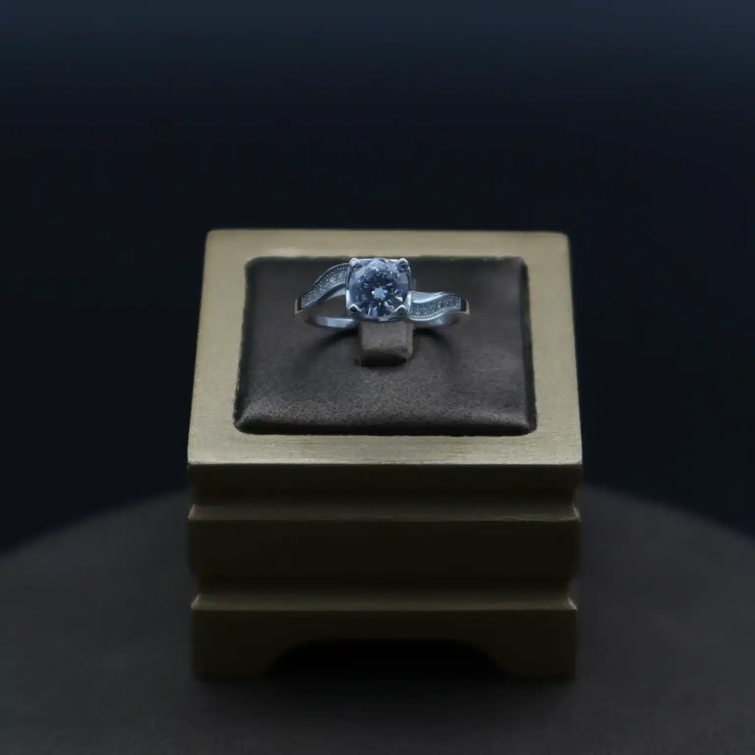 حلقهی سولیتر با آبکاری طلا سفید و نگین اتمی زیرکونیوم یک حلقه بسیار زیبا مناسب مجالس و مهمانی های شماست.