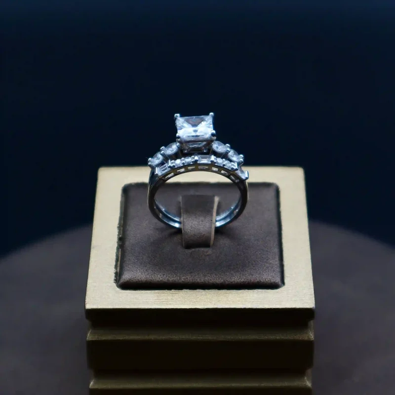 سنگهای استفاده شده در این حلقه و پشت حلقه از جنس زیرکونیوم هستند که زیبایی خاصی به حلقه داده و میتوانند به عنوان جایگزینی زیبا برای طلا باشند.