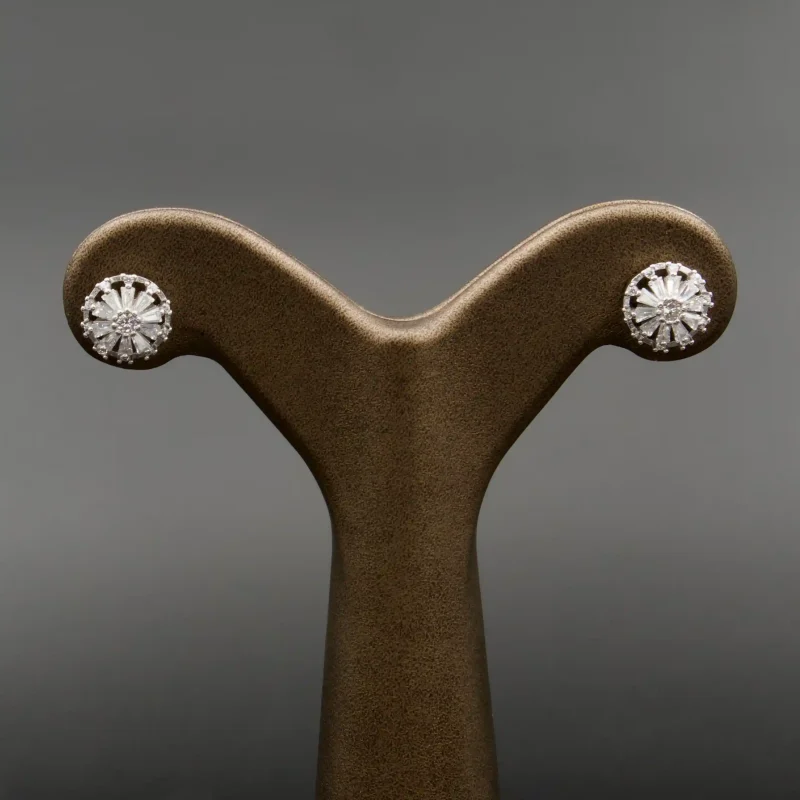 گلی ده برگ با نگین های ریز و درخشنده که در یک دایره نقرهای محصور شده است، طرحی جذاب برای یک گوشواره نقره است.
