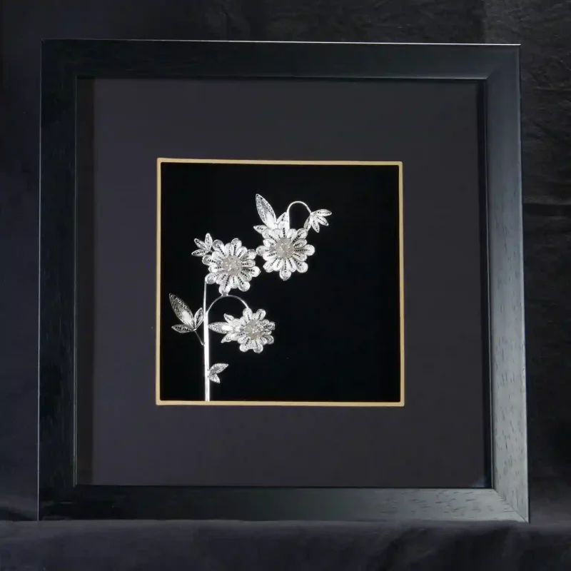 این تابلوی زیبای نقره، تماما کار دست بوده، تصویر گلی زیبا بطور ماهرانه قلم زنی شده و به همراه قاب ملیله می باشد. ابعاد این تابلو نقره دست ساز زیبا 26 سانتیمتر در 26 سانتیمتر است. مليله سازي از جمله ظريفترين رشته هاي فلزکاري نقره و يکي از برجستهترين صنايع دستي ايران در حوزه نقره است. مليله کاري در واقع ظريف کاري نقره با استفاده از مفتول ها و نوارهاي نقره و با بکارگيري ذوق هنري به شيوه منظم و اسليمي در تابلو دست ساز نقره می باشد.