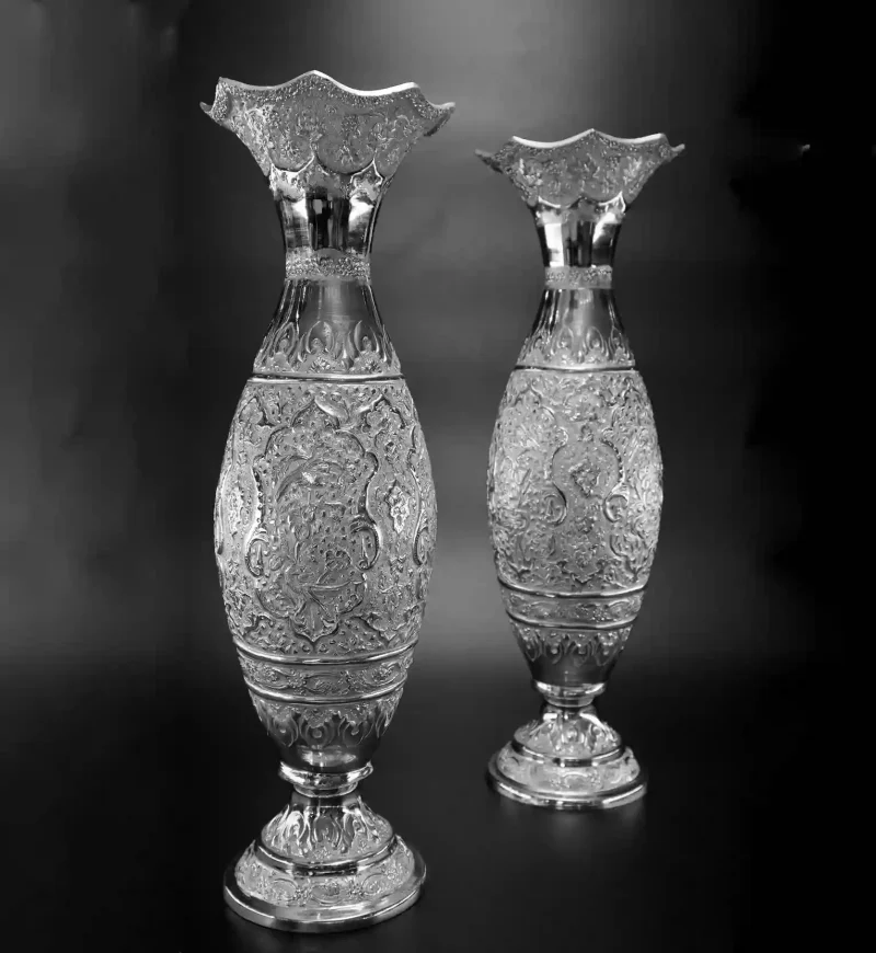 گلدان تمام نقره طرح گل و مرغ اصفهان کد SV-06 با ارتفاع 33 سانتی متر، طرح گل و مرغ حکاکی شده و قیمت درج شده برای یک جفت گلدان می باشد. این گلدان به تمامی از نقره 84 عیار ساخته شده است و کیفیت ساخت بسیار مطلوبی دارد.