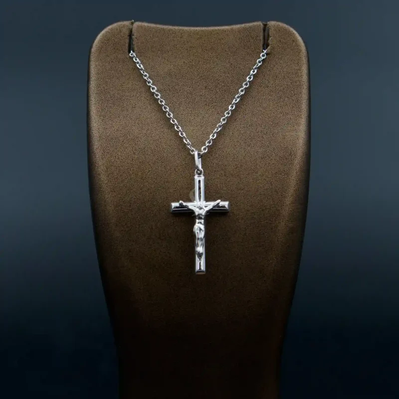 پلاک تمام نقره طرح صلیب با آبکاری چندلایه طلا از نقره با عیار 925 ساخته شده، نقش صلیب و حضرت عیسی مسیح به صورت برجسته روی این پلاک کار شده است.