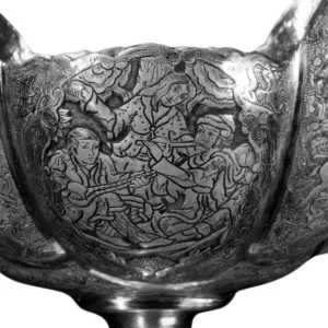 این آجیل خوری به تمامی از نقره 84 عیار ساخته شده است. به جزئیات ظرف دقت کنید به طرح صورتی که بر روی بدنه ظرف قلمزنی شده است، توجه کنید و هنر دست را لمس کنید.