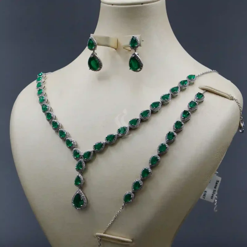 سرویس نقره طرح جواهر زمرد کد JS-12 ساخته شده از نقره با عیار 925 یک مدل زیبا، با تزئین نگین های اتمی زیرکونیا طرح زمرد است.