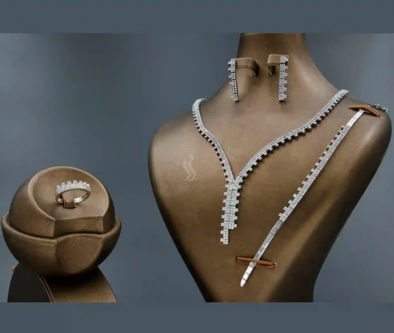 سرویس کامل نقره عروس مدل زینت با آبکاری طلا کد JS-24 شامل یک گردنبند، یک جفت گوشواره آویزی، دستبند و انگشتر ساخته شده از نقره با عیار 925 می باشد.
