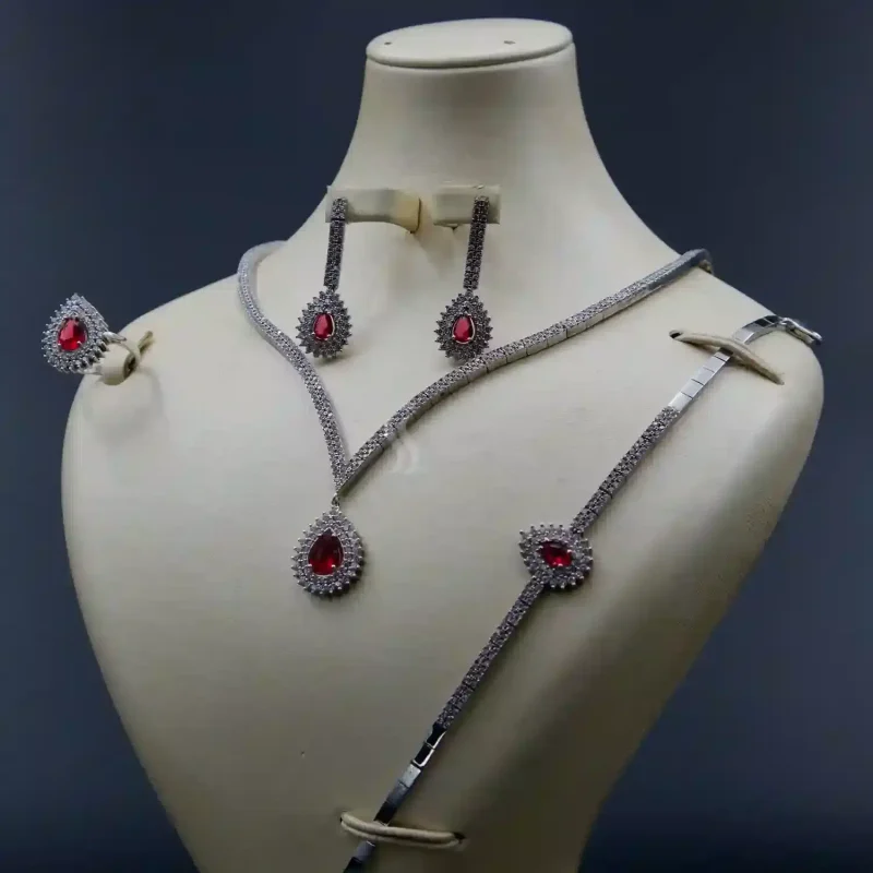 بر روی گردنبند این سرویس مجلسی و زیبا با نگین های اتمی زیرکونیوم کار شده و درمرکز گردنبند نگین اشکی شکل زرح جواهر یاقوت قرار گرفته است.