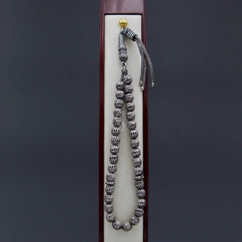 تسبیح نقره سیاه قلم متشکل از تعدادی مهره تمام نقره طرح دار با عیار 925 می باشد که به وسیله ریسمان محکمی به صورت یک رشته درآمده و به کمک آن شمارش ذکر ها و دعاها را نگه می دارند.