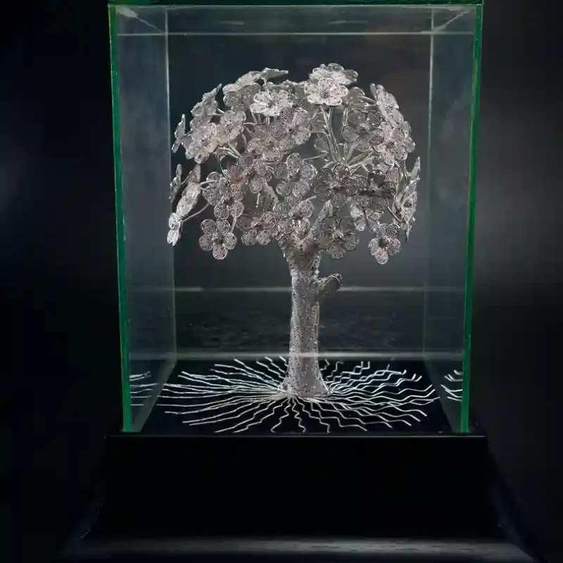 مجسمه نقره درخت به عنوان یک نمای زیبا از طبیعت و زیبایی درختان خلق شده است. این دکوری نقره با استفاده از تکنیک میلهکاری با مفتولهای نازک نقره و ابتکار هنری ساخته و طراحی میشود.