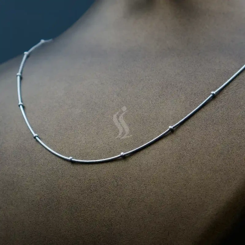 زنجیر نقره مدل گوی دار مدل بسیار شکیل و زیباییست که در عین ظرافت ،جذابیت خیره کننده ای دارد، آبکاری طلا سفید این محصول سبب براقیت دو چندان آن شده و نظر هر ببیننده ای را به خود جلب می کند.
